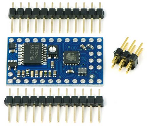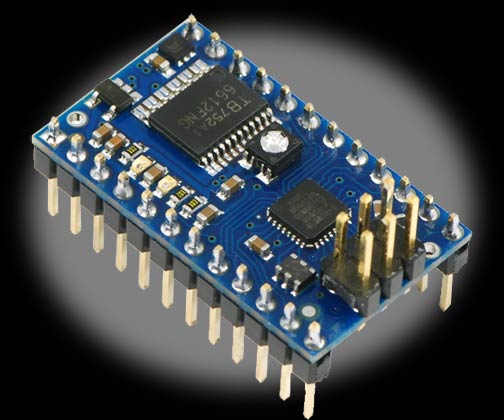 The Baby Orangutan is a complete control solution for small robots, all packed into a tiny 1.2" x 0.7" 24-pin DIP package. |