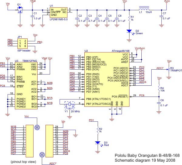 0-PL1220 Baby Orangutan B-328 Robot Controller <p><font color="00ff66" size="2" face="Arial, Helvetica, sans-serif">The Baby Orangutan is a complete control solution for small robots, all packed into a tiny 1.2" x 0.7" 24-pin DIP package. Its compact design eliminates bulkier components such as the LCD and switches while retaining the most essential features of the Orangutan robot controller line: a programmable ATmega48, ATmega168 (discontinued), or ATmega328P AVR microcontroller and a dual H-bridge for direct control of two DC motors. This integrated motor driver sets the Baby Orangutan B apart from similarly-sized microcontroller boards from other manufacturers. Two on-board indicator LEDs, a trimmer potentiometer, a 20 MHz resonator, and reverse battery protection round out the basic hardware features of the Baby Orangutan.</font></p>