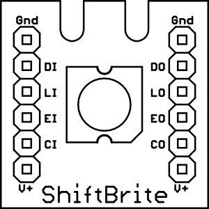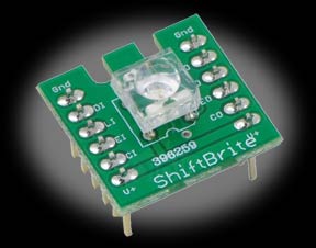 The ShiftBrite is a module by macetech that integrates the Allegro A6281 3-channel constant current LED driver with a large, high-brightness RGB LED. Using just three digital output pins and a simple protocol, your microcontroller can control a long chain of ShiftBrites. Each ShiftBrite in the chain can be independently changed to any of the 1,073,741,824 possible colors to create dynamic displays and decorations. Adjustable current for each color channel lets you correct for slight differences in brightness. Overtemperature shutdown protects the LED driver from overheating. The pins of the ShiftBrite are spaced 0.1" apart, making them compatible with breadboards and perfboards.
