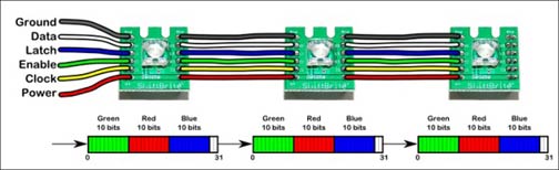 Since the ShiftBrite is controlled by Allegro's A6281 LED driver, careful reading of the A6281Ős datasheet (315k pdf) is recommended. Each ShiftBrite input is buffered and output on the corresponding output pin. This allows you to chain together ShiftBrites without increasing the number of IO pins dedicated to controlling the ShiftBrites. The picture below shows three ShiftBrites chained together.