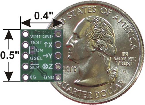 This tiny three-axis accelerometer is a breakout board for Freescale's MMA7361L MEMS (micro-electro-mechanical systems) low-g accelerometers. The MMA7361 is a great IC, but its small, leadless packages makes it difficult for the typical student or hobbyist to use. This carrier board includes all of the components in the part's recommended connection diagram and breaks the pins out to a 0.5 x 0.4in. 10-pin DIP form factor that is easy to use with standard solderless breadboards and 0.1" perfboards.