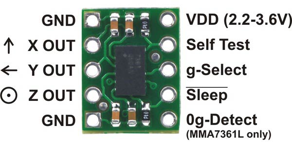 The sensitivity selection pin, g-Select, is internally pulled low, which selects for a default sensitivity of ±1.5g (800 mV/g) on the MMA7361L carrier. Driving the pin high selects for a sensitivity of ±6g (206 mV/g) on the MMA7361L carrier.