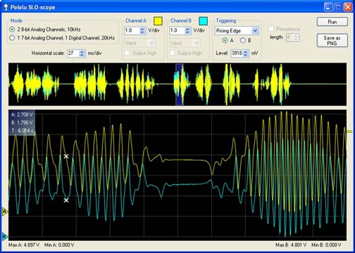 This device can also act as a two-channel, severely limited oscilloscope (SLO-scope) using the A and B pins as analog voltage inputs and the Pololu SLO-scope application for Windows. The SLO-scope can measure voltages between 0 and ~5 V (the maximum is limited by the USB bus voltage), or higher if you use an external voltage divider, and it supports two sampling modes: 10 kHz sampling of two 8-bit analog inputs or 20 kHz sampling of one 7-bit analog input and one digital input. This feature can help you debug your circuits and firmware by seeing what the voltages are doing at various nodes. (Please note that the SLO-scope feedback is quite limited and is not intended as a substitute for a real oscilloscope or a good multimeter, which will have much higher input impedance, better resolution and range, and higher sampling frequency.)