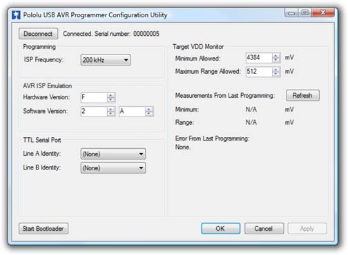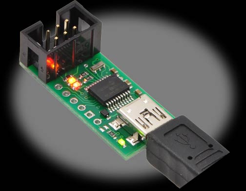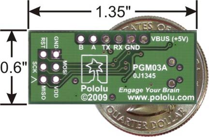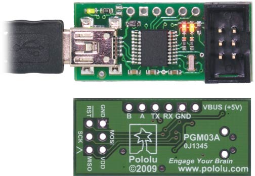 The Pololu USB AVR Programmer is an extremely compact, low-cost in-system programmer (ISP) for Atmel's AVR mirocontrollers, which makes this device an attractive programming solution for AVR-based controllers. The USB AVR programmer connects to your computer's USB port via an included USB A to mini-B cable and communicates with your programming software, such as AVR Studio or AVRDUDE, through a virtual COM port using the AVRISPV2/STK500 protocol. The programmer connects to your target device via an included 6-pin ISP programming cable (the older, 10-pin ISP connections are not directly supported, but it's easy to create or purchase a 6-pin-to-10-pin ISP adapter).