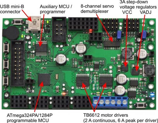 0-PL1325 Orangutan SVP-324 Robot Controller (assembled) <p><font color="00ff66" size="2" face="Arial, Helvetica, sans-serif">The Orangutan SVP robot controller is a complete control solution for small and medium-sized robots running at 6-13.5V. The module is designed around the powerful Atmel ATmega324PA AVR microcontroller (32 KB flash, 2 KB RAM, and 1 KB EEPROM) or ATmega1284P (128 KB flash, 16 KB RAM, and 4 KB EEPROM) running at 20 MHz and features a full complement of peripheral hardware to support robotics applications: dual motor drivers capable of delivering 2A continuous (6 peak) per channel, a demultiplexer for easy control of up to eight servos with a single hardware PWM, a removable 16x2 character LCD with backlight, a user trimmer potentiometer, a buzzer for simple sounds and music, three user pushbuttons, and two user LEDs. The board also provides 21 free I/O lines, of which 12 can be used as analog inputs, and two switching buck (step-down) voltage regulators--one for the 5V bus and one adjustable from 2.5V to 85% of VIN--each capable of supplying 3 A, which means there's plenty of room and power for adding sensors, servos, and other peripherals.</font></p>