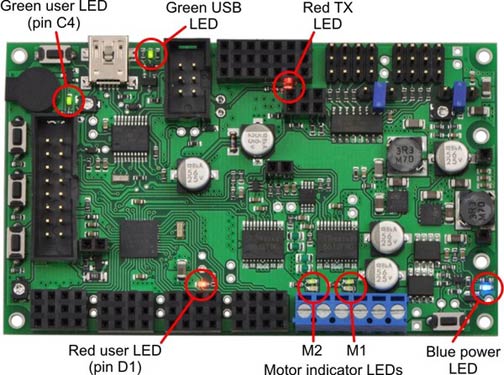 21 free I/O lines: 17 free I/O lines on the main AVR MCU, of which 8 can be analog inputs; 4 input lines on the auxiliary processor, which can be either 4 analog inputs or dual quadrature encoder inputs; 2 hardware UARTs<br />