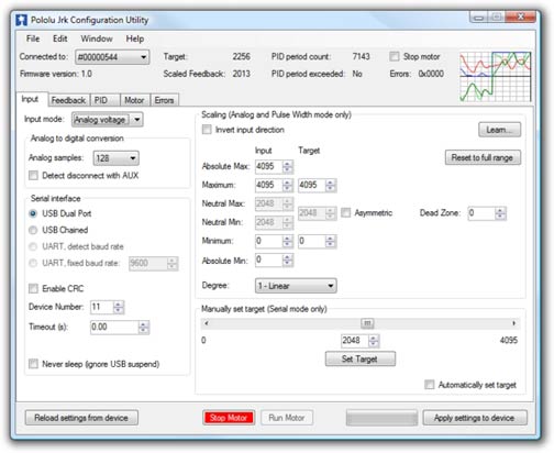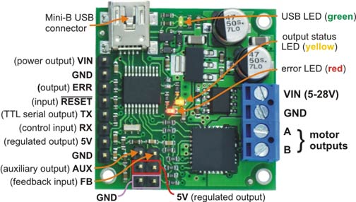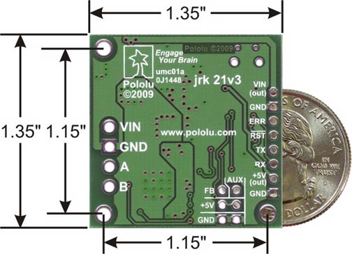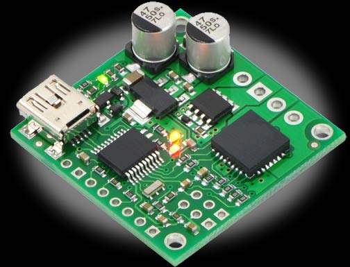 0-PL1392 Jrk 21v3 USB Motor Controller with Feedback <p><font color="00ff66" size="2" face="Arial, Helvetica, sans-serif">The Jrk 21v3 is a versatile, general-purpose motor controller that supports a variety of interfaces, including USB. The broad operating range from 5V to 28V and continuous output current of 3A (5A peak) allow this board to control most small DC brushed motors. Analog voltage and tachometer (frequency) feedback options allow quick implementation of closed-loop servo systems, and a free configuration utility (for Windows XP or Vista) allows easy calibration and configuration through the USB port.</font></p>