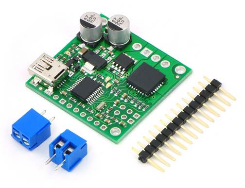 The Jrk ships with a 14x1 straight 0.100" male header strip and two 3.5mm, 2-pin terminal blocks. To provide maximum flexibility, none of these parts are soldered to the board.</font></p>