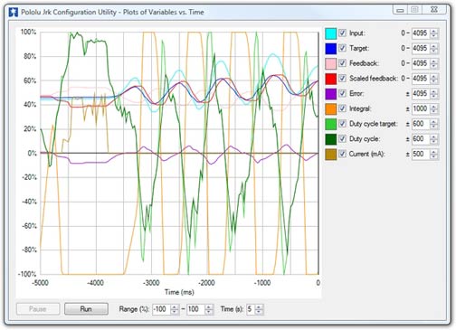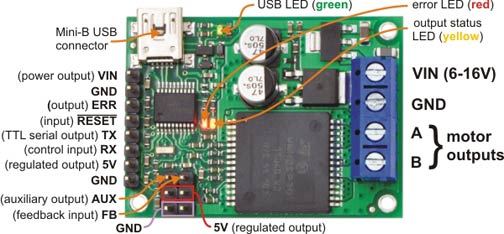 0-PL1393 Jrk 12v12 USB Motor Controller with Feedback <p><font color="00ff66" size="2" face="Arial, Helvetica, sans-serif">The JRK 12v12 is a versatile, general-purpose motor controller that supports a variety of interfaces, including USB. The 6V to 16V operating range and high continuous output current of 12A (30A peak) allow this board to control many medium-sized DC brushed motors. Analog voltage and tachometer (frequency) feedback options allow quick implementation of closed-loop servo systems, and a free configuration utility (for Windows XP or Vista) allows easy calibration and configuration through the USB port.</font></p>