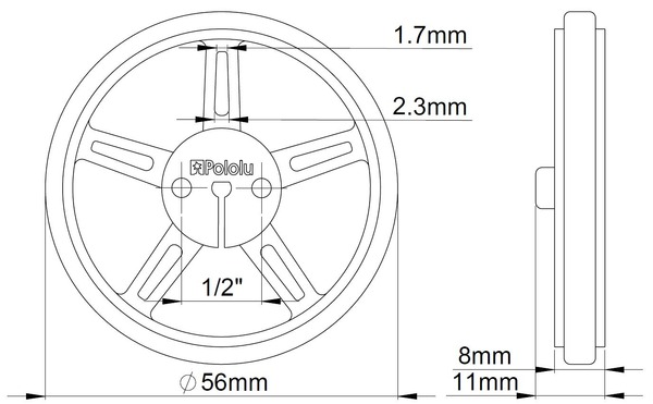These black plastic wheels press fit onto the 3mm D shafts of our mini and micro metal gearmotors to make a nice drive solution for small robots. The wheels have silicone tires and measure 60 mm (2.36") in diameter. Two additional mounting holes make it possible to use the wheel with several of our universal mounting hubs. The wheels are sold in pairs.