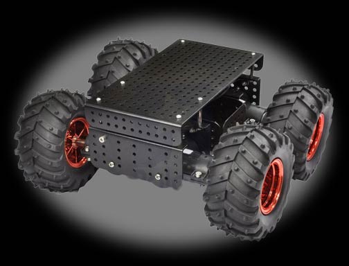 This is a differential-drive chassis, meaning that turning is accomplished by driving the motors on the two sides of the platform at different speeds. The two motors on each side of the robot are wired in parallel, so only two channels of motor control are required to get this chassis moving. The motors are intended for a maximum nominal operating voltage of 7.2 V (2V minimum), and each has a stall current of 6.6 A and a no-load current of 420 mA at 7.2 V. Since the motors will briefly draw the full stall current when abruptly starting from rest (and nearly twice the stall current when abruptly going from full speed in one direction to full speed in the other), we recommend a motor driver capable of supplying the 14A combined per-channel stall current of these motors at 7.2 V. We offer several motor controllers that meet these power requirements and make it easy to get this chassis moving: