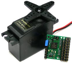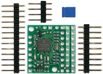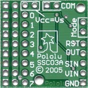 The Pololu micro serial servo controller (SSC) is a very compact solution for controlling up to eight radio control (RC) servos from a computer or microcontroller. The controller measures just 0.91in. x 0.91in., yet it is one of the most full-featured servo controllers available. Each servo speed and range can be controlled independently, the baud rate is detected automatically over a 1200-38400 bps range, and multiple units can be daisy-chained on one serial line to control up to 128 servos. Three status LEDs and an integrated level converter for RS-232 applications get you up and running quickly. The micro serial servo controller is dwarfed by even a standard servo, but it can control any standard RC servos, including giant 1/4-scale servos.