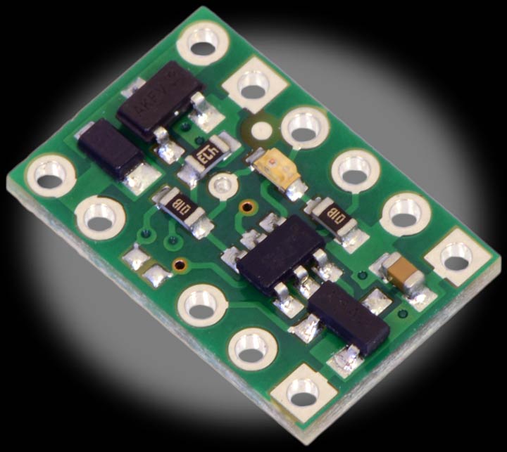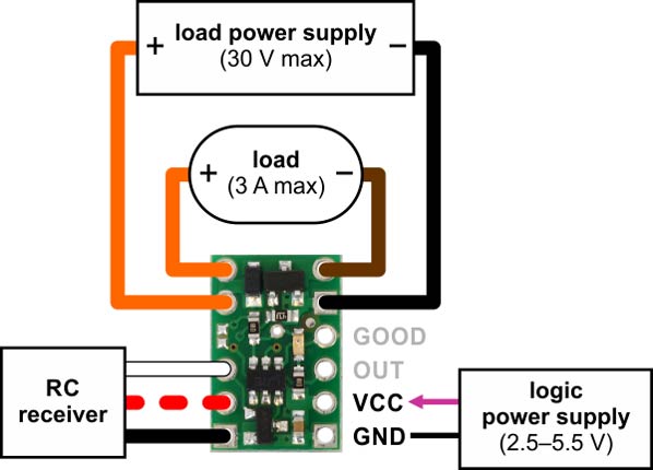 The Pololu RC switch with Small Low-Side MOSFET can be used with standard hobby radio control systems for radio control switch applications or simple interface applications. Example uses include converting extra RC receiver or servo controller outputs to simple high/low signals that can control LEDs or relays and connecting RC systems to microcontroller projects that do not have the necessary resources for decoding the RC interface. Two outputs indicate the presence of a valid signal and whether the switch is on or off, and an integrated low-side MOSFET turns on when the switch is on, allowing the board to drive small loads directly. The switch also features a flyback (or freewheeling) diode across the load outputs so that you can connect a coil to them, such as a motor or relay, without any additional external components.