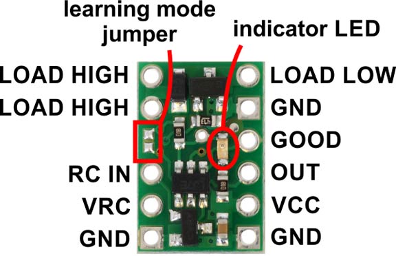 The RC switch measures the width of incoming RC pulses and compares it to a user-configurable threshold (with ±64 µs of hysteresis) to decide whether to turn on the MOSFET. By default, the threshold is approximately 1700 µs, with switch activation occurring above the threshold (longer pulses), but the switch has a learning mode that allows you to change the threshold and the activation direction. A safe-start feature reduces the likelihood of unexpected activation.