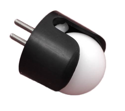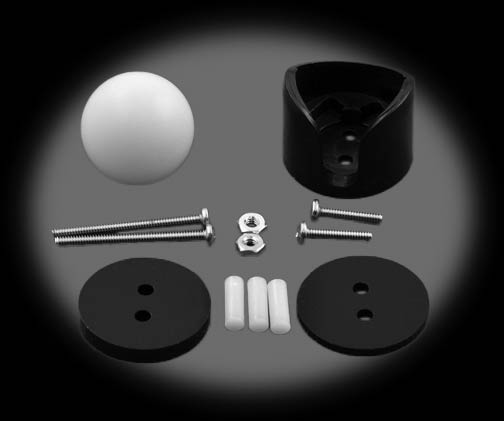 This ball caster kit includes a black ABS housing, a 3/4in. diameter plastic ball, three dowel pin rollers, two spacers (1/16in. and 1/8in. thick), and two #2 screw sets.