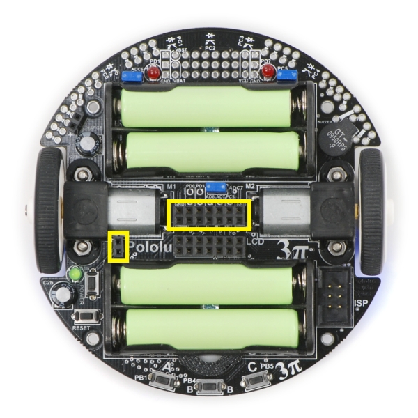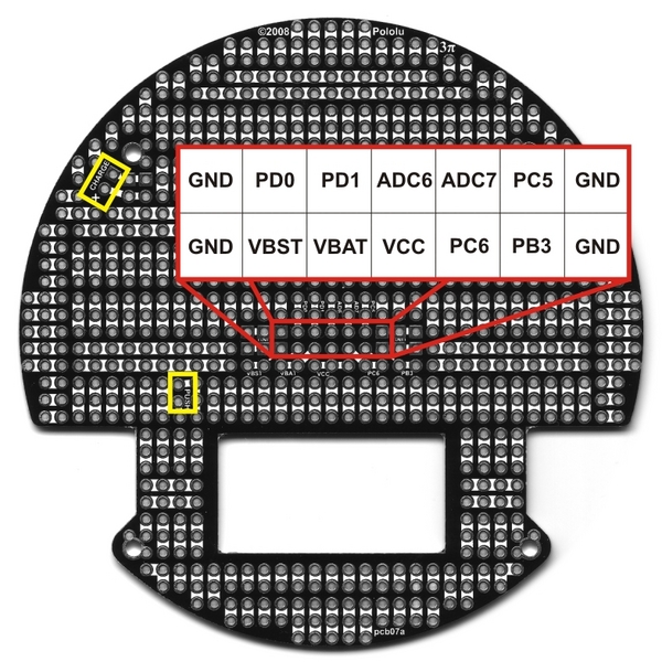 The expansion PCB matches diameter of the 3pi chassis and mounts just above the tops of the wheels using the four included screws and spacers. Once assembled, the PCB has electrical connections to the base that allow you interface your own electronics with the 3pi robot, which is sold separately. These connections give you access to the ATmega168's free/jumpered pins, as well as to the three on-board voltages: VBAT (battery voltage), VCC (regulated 5V), and VBST (regulated 9.25V that is supplied to the motors). Additionally, the expansion PCB connects to the base's power button and battery charge port, allowing you to add your own power buttons and charge ports.
