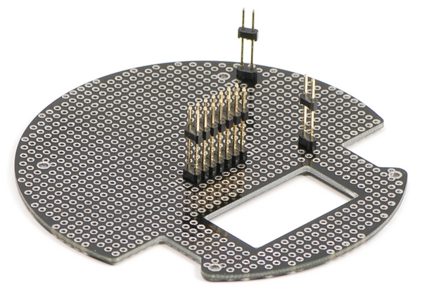 This kit includes a round printed circuit board (PCB) with holes spaced on a 0.100in. grid, one extended 2x7 male header, two extended 2x1 male headers, a 2x7 female header, two 2x1 female headers, four 7/8in. nylon spacers, four 1-1/4in. screws, and four nuts.