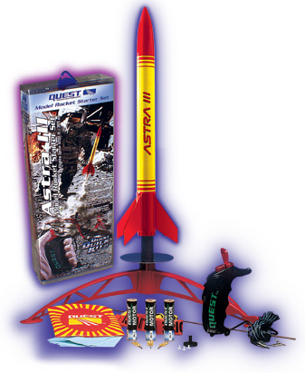 The Quest Astra III Quick Kit starter set combines Quest's rugged ASTRA III Quick Kit, 3 A6-4 model rocket engines and a complete launch system. Everything you need for a day of flying model rockets. The launch equipment can be used to continue your adventure and fly the entire fleet of Quest rockets!