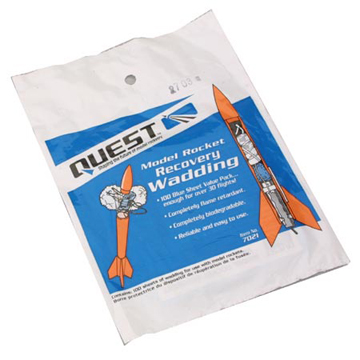 Quest model rocket recovery wadding contains 100 sheets of fire resistant tissue sheets per pack. Quest Recovery Wadding is lightweight and bio-degradable.