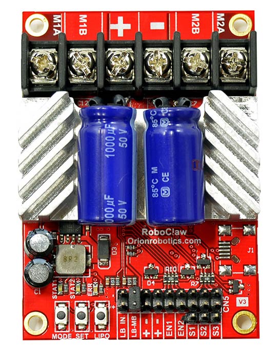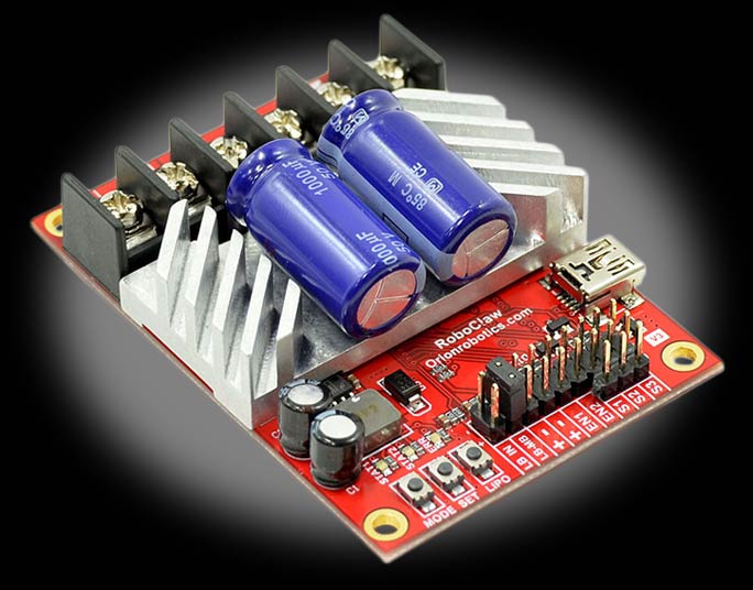 The RoboClaw 2x30 Amp motor controller is an extremely efficient, versatile, dual channel synchronous regenerative motor controller. It can supply two brushed DC motors with 30 Amps continuous and 60 Amps peak. The RoboClaw also includes a 3 Amp switch mode BEC. Power any device from RoboClaw safely with plenty of power to spare.