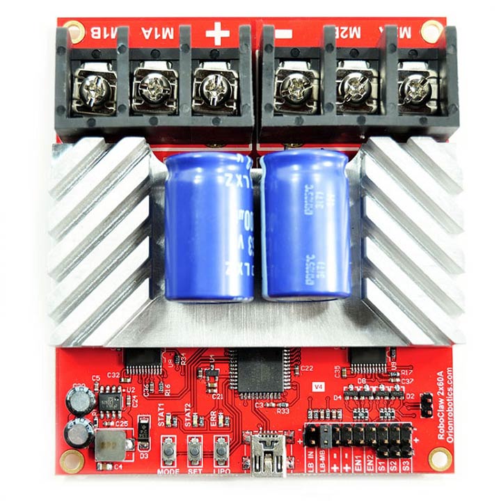 The RoboClaw 2x60 Amp motor controller is an extremely efficient, versatile, dual channel synchronous regenerative motor controller. It can supply two brushed DC motors with 60 Amps continuous and 120 Amps peak. The RoboClaw also includes a 3 Amp switch mode BEC. Power any device from RoboClaw safely with plenty of power to spare.