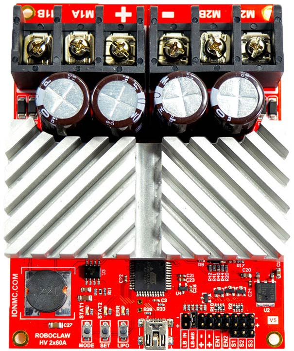 The RoboClaw HV 2x60A motor controller 60V is an extremely efficient, versatile, dual channel synchronous regenerative motor controller. It can supply two brushed DC motors with 60 Amps continuous and 120 Amps peak. The Roboclaw HV 2x60A 60V also support main battery voltages upto 60V.