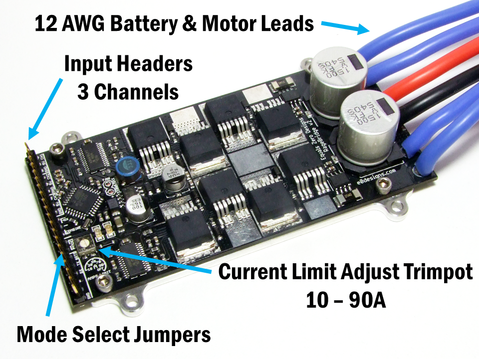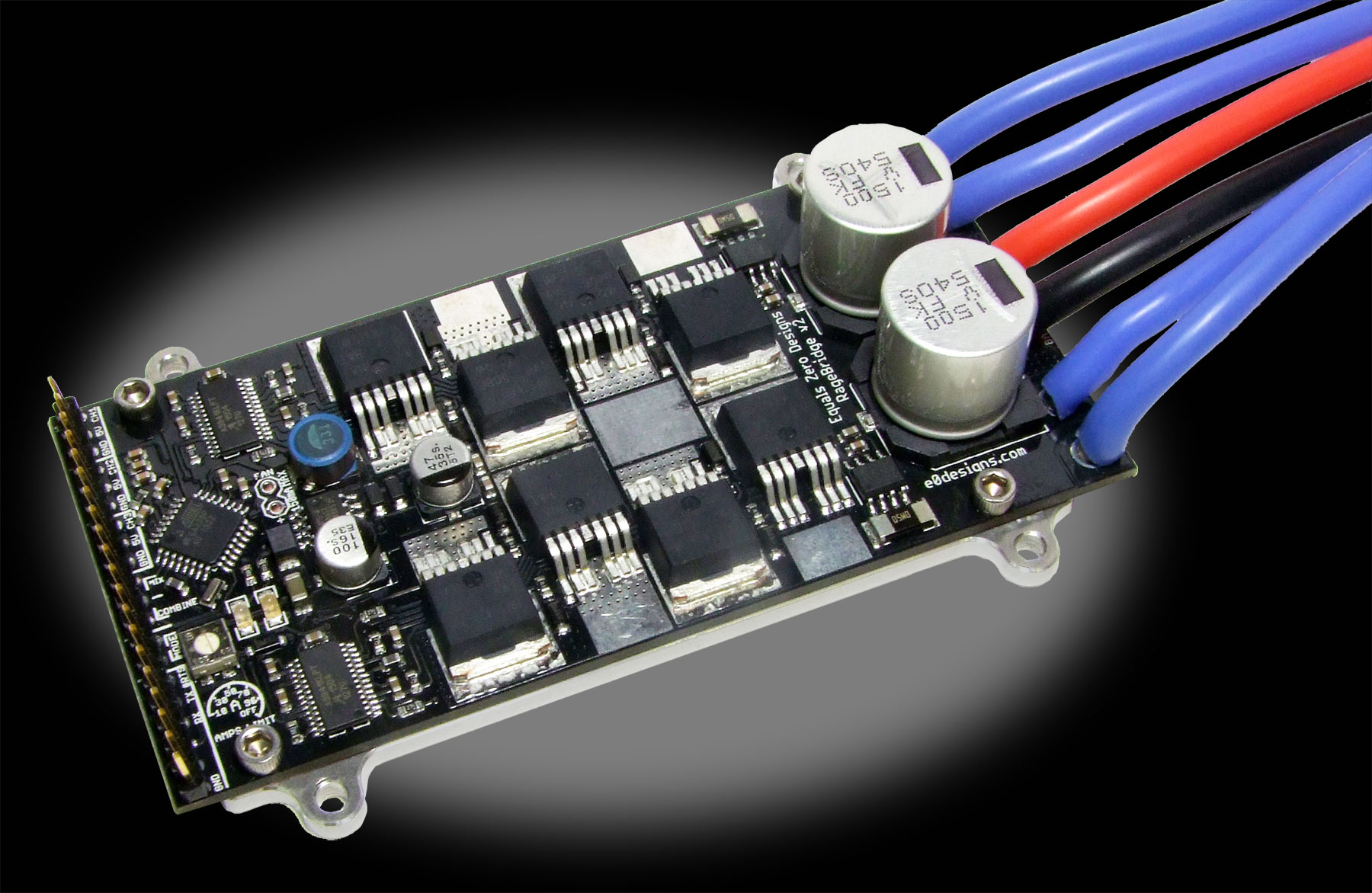 RageBridge 2 is a dual-channel DC brush controller designed for R/C, analog signal, or TTL serial-connected systems which drives 1 or 2 motors at 40 or more amps all day, anywhere from 8 to 40 volts, with no fancy frills.