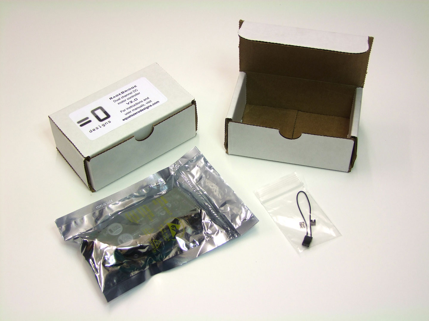 RageBridge 2 is a dual H-bridge allowing control of up to two DC brush motors independently, integrated onto a single board. The switching topology of RageBridge 2 is known as "synchronous rectification". In this method, the motor is always being alternately powered and then braked. While it may sound unnecessarily complicated, it significantly decreases heat dissipation in both motor and power MOSFETs because current is never just being burnt off as heat for a portion of the switching cycle. The result is a controller that can handle more power in a smaller package.