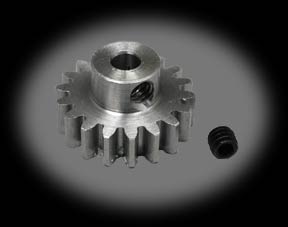 32 pitch pinions precision cut from hard steel alloy, lightened for reduced weight. 1/8 inch bore. One 5-40 set screw included.