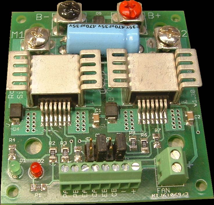 The Simple-H does not have any on-board logic to interpret R/C, serial, analog voltage or other commands. An external signal source is required to translate command inputs into the switching signals needed to drive the Simple-H power chips. This flexibility allows the Simple-H to be driven from from a signal source as simple as a pushbutton or as complex as a microcontroller or BasicStamp. Even a desktop or laptop PC can be used through a parallel port or USB port expander.