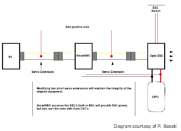 The SmartBEC installs between your ESC and receiver, so you don't have to modify your speed control to disable its internal BEC, just plug it in. SmartBEC works by modifying the throttle commands sent to the ESC, so if the ESC has low voltage cutoff settings, they will still be active. Whichever LVC occurs first (ESC or SmartBEC) will take precedence.