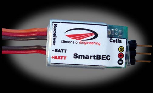 SmartBEC uses a switching type power supply to efficiently convert high pack voltages into the 5v your receiver and radio gear needs. A switching BEC does not become grossly inefficient when used from high voltage sources. Because of this you will not need to fear losing radio power from a BEC shutdown. Adding a SmartBEC will allow you to stop carrying around a second receiver battery, often saving several ounces of weight. SmartBEC supports up to four standard servos or six sub-micro servos, so the majority of sport and parkflyer type aircraft are suitable. It puts out almost no EMI, so you can use it without fear of glitching.