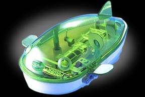 Transparent green plastic upper body and white under-belly give it a funky