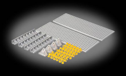 The Tamiya 70157 Universal Plate Set (2pcs.) is a customizable chassis designed to be compatible with multiple Tamiya products. This set includes two plastic plates with an 11 x 31 grid of 3 mm holes spaced 5 mm apart, which provide space for many mechanical connections. The four included eight-hole angle brackets can connect the two plates and additional Universal Plates or can serve as a mounting point for an axle. The plate set also includes four shaft mounts (the triangular brackets in the above picture) for supporting axles. The kit provides 18 push rivets for connecting the angle brackets and shaft mounts to the plates.