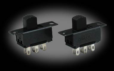 Package contains two 6 volt, 4 amp slide switches. Switch slides back and forth for on/off. Features black plastic construction and mounting holes on each end. Six silver pins in back for connecting wires.