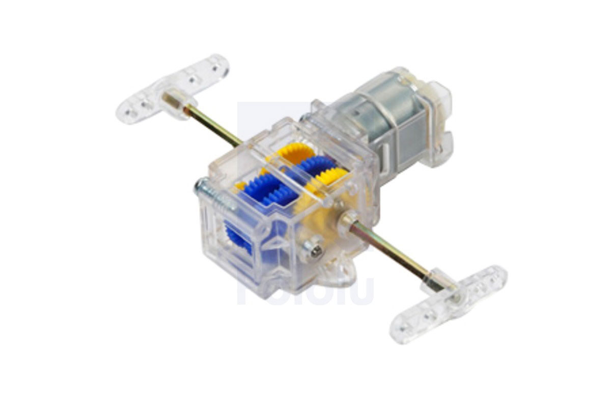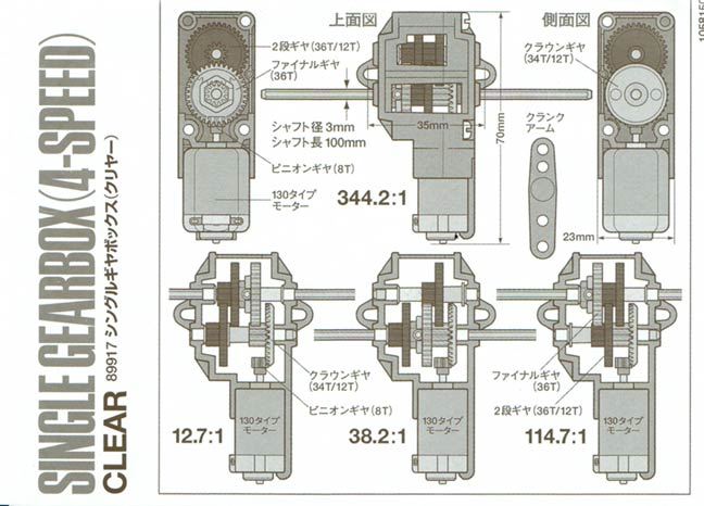 This product has been discontinued. Please see this similar product instead.The Tamiya single gearbox is essentially half of the Tamiya 70168 double gearbox. The kit can be built with gear ratios of 12.7:1, 38:1, 115:1, and 344:1. There are two possible output axle locations (for any given gear ratio, only one output location is possible).