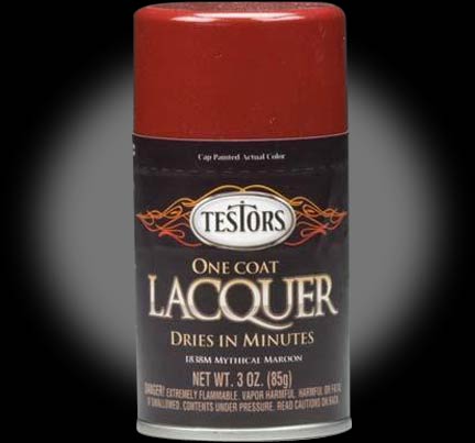 0-TES1838M Testors One Coat Lacquer - Mythical Maroon <p><font color="00ff66" size="2" face="Arial, Helvetica, sans-serif">Hottest metallic colors in one easy step.<br> Durable formula works on most surfaces.<br> Use on models, pine cars, skateboards, helmets, bikes, electronic casings, and more.<br> Dries in minutes.</font></p> <p><font color="00ff66" size="2" face="Arial, Helvetica, sans-serif">3oz.</font></p>