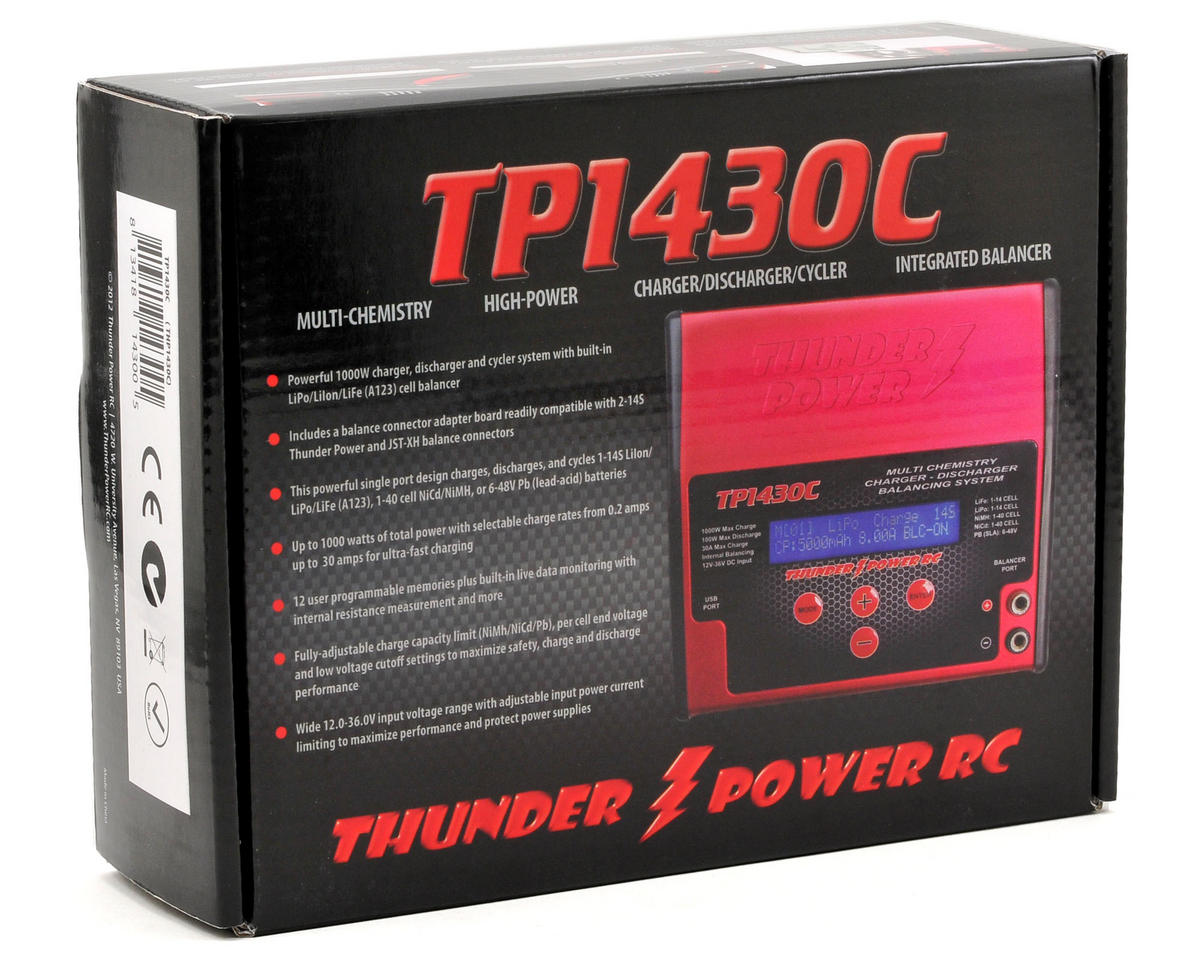The TP1430C is a powerful and advanced multi-chemistry charger, discharger and balancing system. With up to 1000 watts of total charging power the T1430C is equipped to charge, discharge and cycle a variety of 1-14S LiPo, LiIon and LiFe (A123) batteries, as well as 1-40 cell NiCd and NiMH along with 6-48V Pb (lead-acid) batteries. The built-in 2-14S LiPo/LiIon/LiFe (A123) cell balancer and included balance connector adapter board are readily compatible with all Thunder Power balance connectors and the JST-XH balance connectors found on most other batteries. The TP1430C is capable of charging at rates up to 30 amps offering the ability to charge many of the latest-generation LiPo batteries at ultra-fast rates up to 6C and beyond. Other great features include built-in data logging and internal resistance measurement, plus the ability to use a standard USB cable to install future firmware updates available for free download from Thunder Powers website.