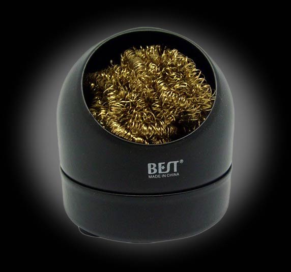 This soldering iron tip cleaner cleans your soldering iron tips without water! It is made of coils of brass, which are softer than the tip plating yet harder than the oxidation that forms on the tip. The tightly twisted coils of brass scrub the oxidation off of the tip of your solder iron without cooling off the tip like a wet sponge will. Just insert the hot iron tip into the coils of brass with a twisting motion and twist it back out, repeat as necessary.