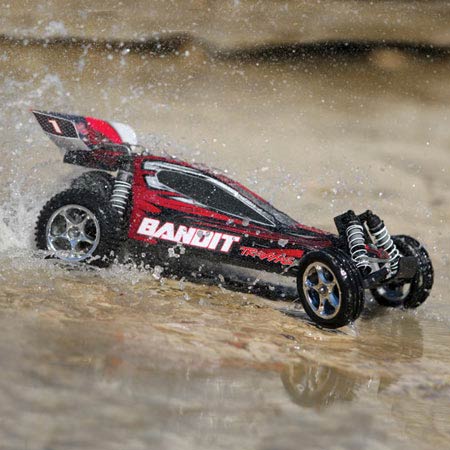 0-TRA2405 Traxxas Bandit Extreme Buggy RTR with XL-5 ESC <font color="red" size="2" face="Arial, Helvetica, sans-serif"><b>This product has been discontinued. Please see <a href="http://www.robotmarketplace.com/products/0-TRA24054.html">this similar product</a> instead.</b><p></font><p><font color="00ff66" size="2" face="Arial, Helvetica, sans-serif">Traxxas literally made a splash with the E-Maxx, E-Revo, and Slash - the industry's first high performance waterproof models. Now the fun and excitement of all-weather R/C is more affordable than ever as Traxxas' top-selling Stampede, Rustler, and Bandit get the full waterproof treatment. The models' XL-5 speed controls and high-torque 2056 servos now wear blue cases to signify they are waterproof, and a new, sealed receiver box holds Traxxas' latest 4-channel micro receiver. With their completely sealed electronics, Traxxas XL-5 models can tackle water, mud, snow, and other wet conditions that park other R/C vehicles on the shelf. Only Traxxas has it!</font></p>