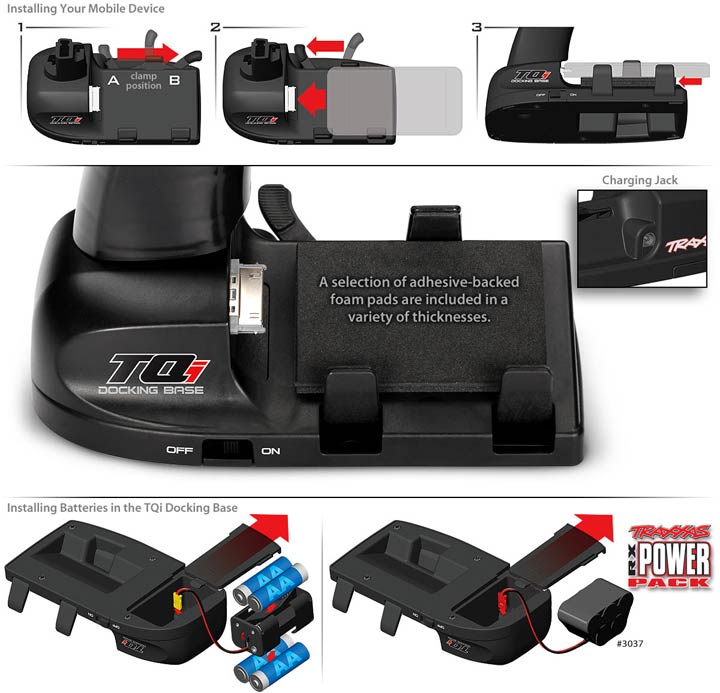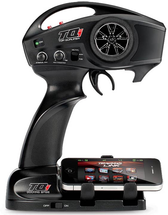 The all-new Traxxas TQiª Radio System arrives with a full compliment of tuning features; long-range, high-output, 2.4GHz signal, and proven Traxxas reliability for rock-solid performance. The TQi 2.4GHz Radio can be equipped with an innovative Docking Base that turns your iPhone¨ or iPod touch¨ into a powerful tuning tool for your Traxxas model. The full-color display combines with the Traxxas Linkª App to deliver an intuitive, high-definition, full-color graphical user interface that unlocks the mysteries of optimizing your radio system for ultimate vehicle control. The Traxxas Link application requires an iPhone 3G/3GS/4/4S, or a 2nd/3rd/4th generation iPod touch.