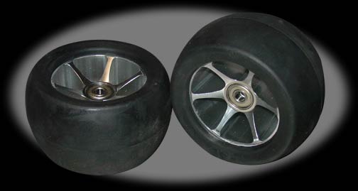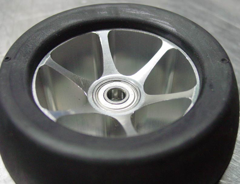aluminum wheel and a hard but grippy rubber, 2.5" wide tread.