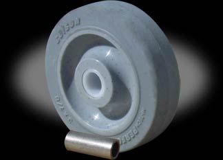 Performa wheels offer the advantages of both hard and soft tread materials in a single wheel. Like a hard tread wheel, Performa rolls easily and is very durable. Like a soft tread wheel, it rolls quietly, protects floors and resists impacts with a cushion ride. It also features maximum weatherability, low temperature flexibility, resistance to chemicals, water and steam, and rejects floor debris such as metal shavings. Non-marking thermoplastic elastomer tread is permanently bonded to durable polyolefin wheel core. The rubber is 65 ±5 Durometer Shore A scale.