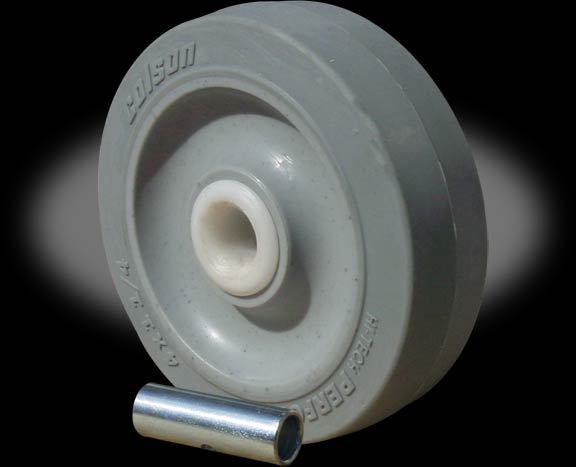 Performa wheels offer the advantages of both hard and soft tread materials in a single wheel. Like a hard tread wheel, Performa rolls easily and is very durable. Like a soft tread wheel, it rolls quietly, protects floors and resists impacts with a cushion ride. It also features maximum weatherability, low temperature flexibility, resistance to chemicals, water and steam, and rejects floor debris such as metal shavings. Non-marking thermoplastic elastomer tread is permanently bonded to durable polyolefin wheel core. The rubber is 65 ±5 Durometer Shore A scale.