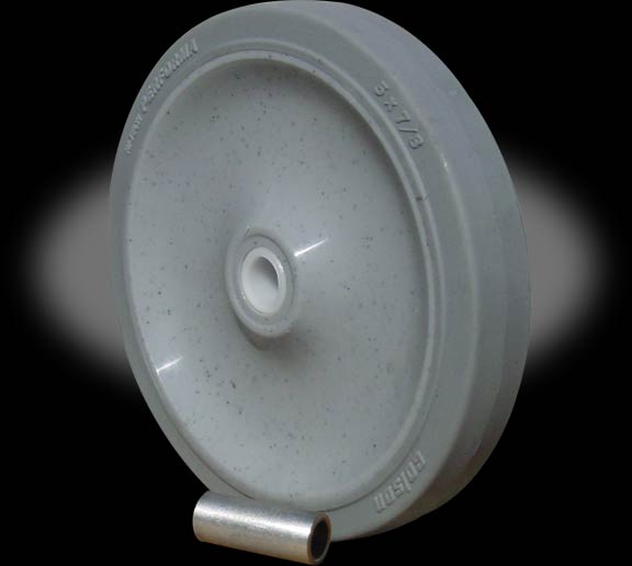 Performa wheels offer the advantages of both hard and soft tread materials in a single wheel. Like a hard tread wheel, Performa rolls easily and is very durable. Like a soft tread wheel, it rolls quietly, protects floors and resists impacts with a cushion ride. It also features maximum weatherability, low temperature flexibility, resistance to chemicals, water and steam, and rejects floor debris such as metal shavings. Non-marking thermoplastic elastomer tread is permanently bonded to durable polyolefin wheel core. The rubber is 65 ±5 Durometer Shore A scale.