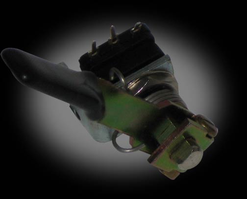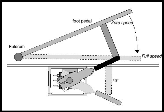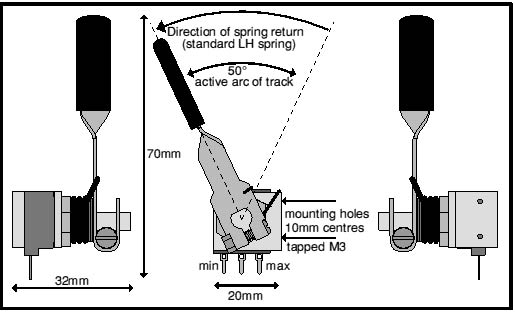 The 'Naked Bell Assembly' is a finger-tip throttle assembly (speed control mechanism) using the 50 degree pot. It has a spring return to zero and is supplied with a mounting bracket and a vinyl-capped lever. The spring is light operation to minimize finger strain from continuous pressure on an over-strength spring, yet is still strong enough to ensure reliable operation. The lever can safely be bent if a different shape is needed. This feature means that if the lever gets accidentally bent, it can be easily re-shaped!