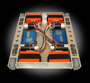 The base plates and the bulkheads are made from 6061-T6 aluminum. The base plates are drilled and countersunk with all the mounting holes for the bulkheads, drive modules, speed controller, and several different sizes and types of batteries. All components are CNC computer machined to tight tolerances for maximum consistency and lowest cost.