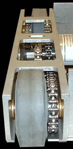 The one-piece extrusion (one each for the left and right drive trains), is precision CNC machined with mounting holes for all the sprockets, wheels, shafts, and motors. Each drive component is supported on both sides of the 3" x 3" square aluminum tubing to avoid "overhung" loads.