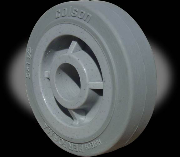 Performa wheels offer the advantages of both hard and soft tread materials in a single wheel. Like a hard tread wheel, Performa rolls easily and is very durable. Like a soft tread wheel, it rolls quietly, protects floors and resists impacts with a cushion ride. It also features maximum weatherability, low temperature flexibility, resistance to chemicals, water and steam, and rejects floor debris such as metal shavings. Non-marking thermoplastic elastomer tread is permanently bonded to durable polyolefin wheel core. The rubber is 65 ±5 Durometer Shore A scale.