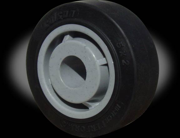 Performa wheels offer the advantages of both hard and soft tread materials in a single wheel. Like a hard tread wheel, Performa rolls easily and is very durable. Like a soft tread wheel, it rolls quietly, protects floors and resists impacts with a cushion ride. It also features maximum weatherability, low temperature flexibility, resistance to chemicals, water and steam, and rejects floor debris such as metal shavings. Non-marking thermoplastic elastomer tread is permanently bonded to durable polyolefin wheel core. The rubber is 65 ±5 Durometer Shore A scale.